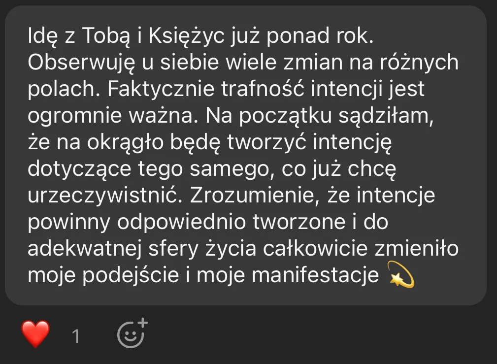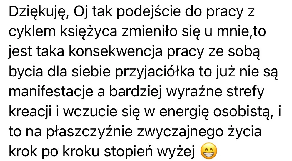 Kreacja z cyklem księżycowym jest sposobem życia, w którym wybierasz oraz kreujesz z miesiąca na miesiąc, aby w perspektywie czasu (zwykle kilku miesięcy), cieszyć się swoimi spełnionymi intencjami oraz procesem, który zabiera Cię głębiej w rozpoznawaniu co już nie jest Twoje, oraz co pragniesz powołać do życia.